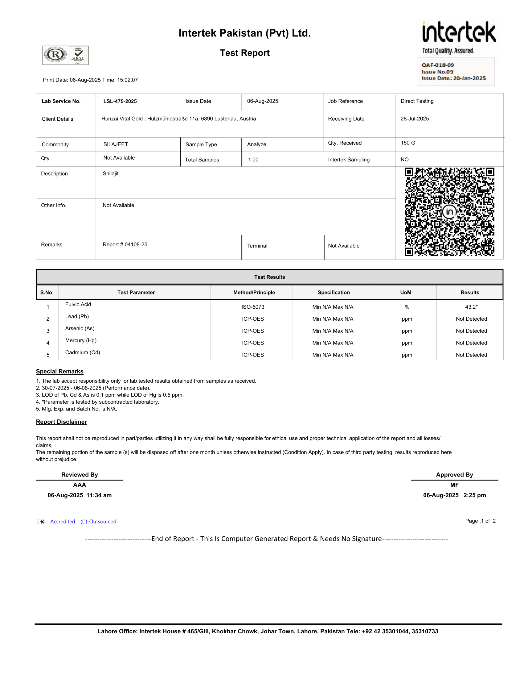 This report examines the heavy metals content (such as lead, cadmium and mercury) in our shilajit resin and whether is in accordance with the provisions prescribed in commission Regulation (EU) 2023/915.